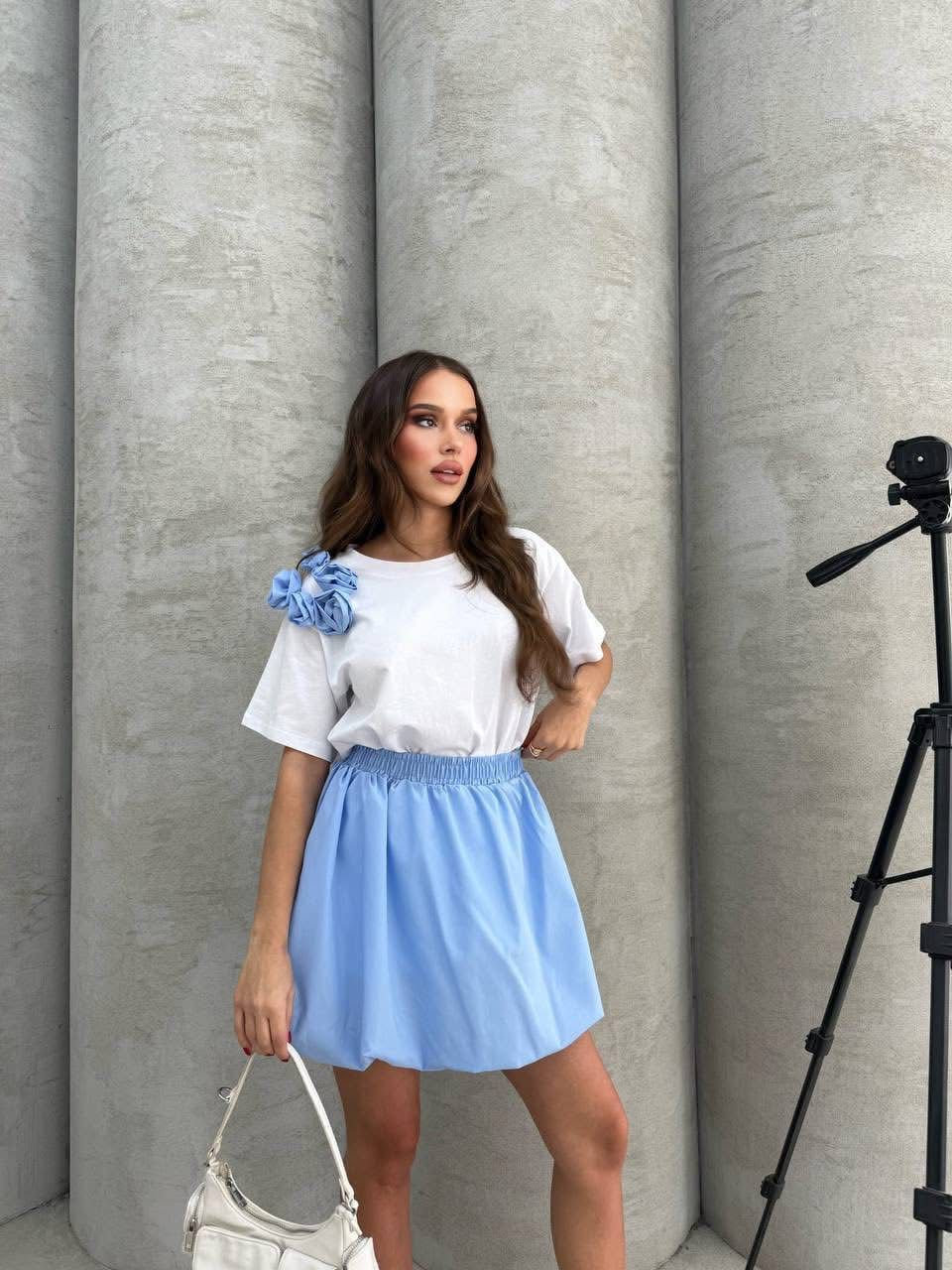 Compleu elegant din două piese, format din fustă albastră și tricou alb cu detalii florale – un măr cu trandafiri – perfect pentru un look proaspăt și feminin. Ideal pentru zilele călduroase sau evenimente casual-chic.