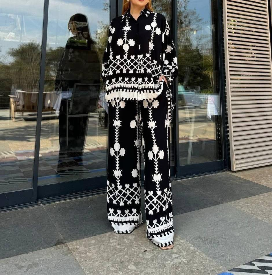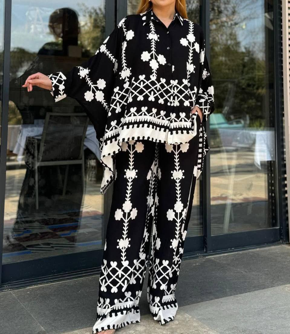 Completează-ți garderoba cu acest compleu negru sofisticat, ideal pentru orice ocazie casual sau office. Pantalonii largi oferă libertate de mișcare și un look relaxat, în timp ce cămășuța oversize, ușor largă, adaugă un aer modern și confortabil ținutei tale.
