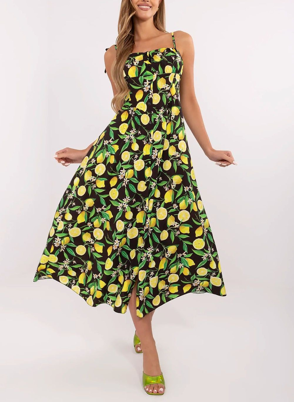 Rochie de vară cu lămâi, rochie midi cu imprimeu fructe, rochie lungă vaporoasă, rochie florală/fructată de vară, rochie fresh vară 2025, rochie lejeră de zi, rochie cu imprimeu mediteranean.